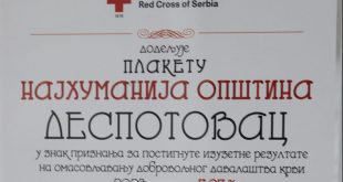 Opština Despotovac je i u 2023. godini, kao i prethodnih osam godina za redom, osvojila prestižnu titulu najhumanije opštine Republike Srbije. Ovo priznanje, koje potvrđuje izuzetnu humanost građana, svrstava Despotovac na čelo najhumanijih gradova u Pomoravlju i na prvo mesto među 183 opštine u Srbiji. Sa 7,07% stanovništva koje redovno …