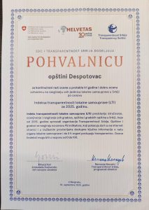 Opština Despotovac je dobila pohvalnicu za kontinuirani rast ocene u prethodne tri godine i dobru ocenu ostvarenu na rangiranju svih jedinica lokalne samouprave u Srbiji na osnovu Indeksa transparentnosti lokalne samouprave (LTI) za 2025. godinu.